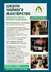 Полное погружение в чайный мир ждет вас на курсе с одноименным названием. Проводником в увлекательном путешествии станет наш мастер Евгений Кашкалов. В 1990-х годах он одним из первых возродил чайную культуру в России. Опыт преподавания у Евгения – 20 лет, половина истинных ценителей китайского чая в СПб – его ученики.