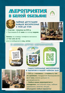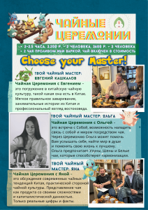 Погрузитесь в культуру и философию чая на традиционной церемонии – это поможет ощутить гармонию и обрести внутренний баланс. Специально для вас напиток заварит чайный мастер – он поможет каждому листу раскрыть аромат и вкус. Длительность церемонии – 1-3 часа. Мастер приедет к тому времени, о котором вы договоритесь заранее. Стоимость чайной церемонии зависит от количества участников. Для одного или двух человек цена фиксированная – 3200 рублей, для трех и больше – 1200 рублей с человека. За чай платить не надо – он уже включен в стоимость.