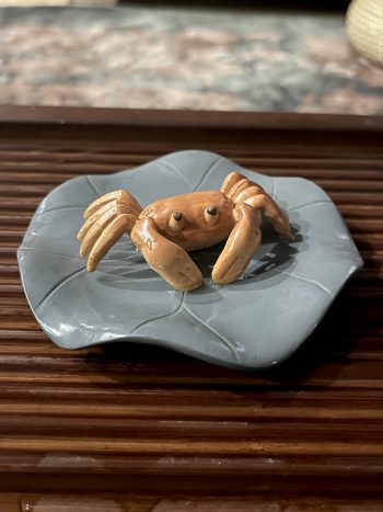 Небольшой милый крабик на листе кувшинки, размером 11 на 3 см и весом 121 грамм. При поливе горячей водой краб меняет цвет и становится ярко оранжевого цвета.