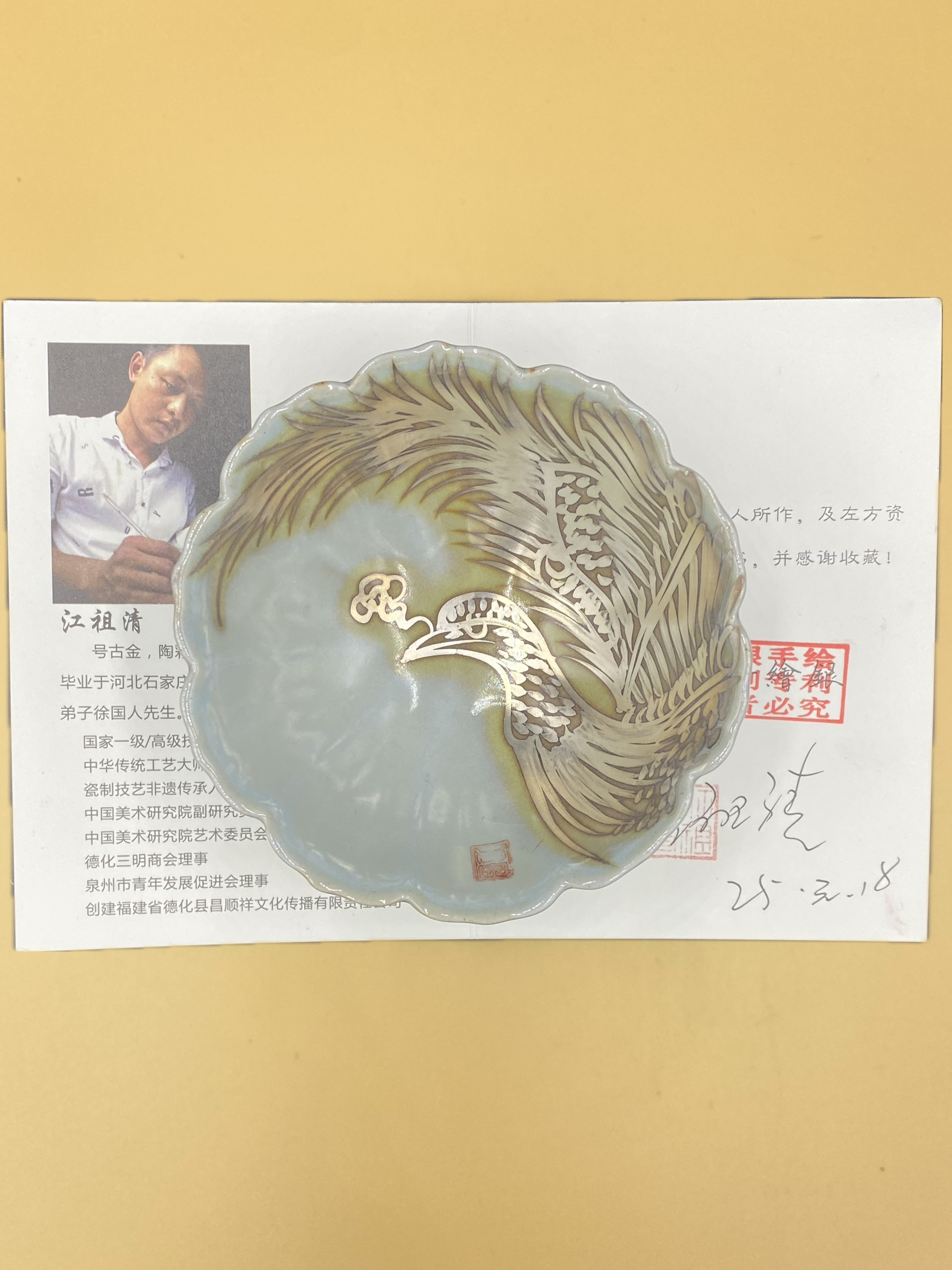 Цзян Цзуцин, также известный как Гу Цзинь, — художник-керамист, родившийся в Цинлю, провинция Фуцзянь, – мастер традиционного китайского ремесла, наследник нематериального культурного наследия – техники обжига фарфора Дэхуа – и мастер керамического искусства провинции Фуцзянь. Он является создателем серебряных чашек с ручной росписью и первым, кто вручную расписал чайные чашки чистым серебром. Он работал в таких керамических компаниях, как Shanxi Jiaming Group и Dongguan Qifute, занимаясь дизайном и разработкой керамических декоров.