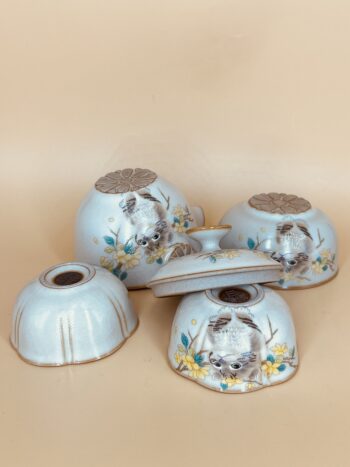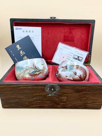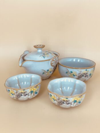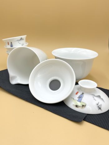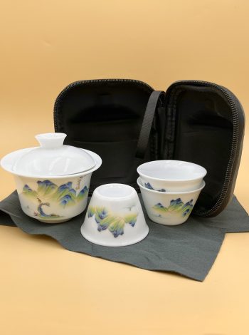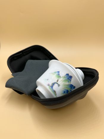Компактный добропожелательный в исполненнии целей набор из 5 предметов в чехле: фарфоровая гайвань 150 мл., стеклянный чахай 200 мл. (сливник), 3 фарфоровые пиалы по 35 мл.