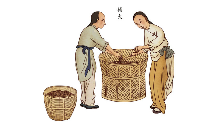 Поскольку во время сортировки и сортировки неизбежно проникает влага, перед упаковкой необходимо повторить сушку. Чтобы разжечь огонь, поместите просеянный чай в клетку для запекания и испеките его под ситом на углях. Пополнение огня очень важно для контроля тепла. Помимо дальнейшего рассеивания воды для облегчения хранения, пополнение огня также усилит аромат чая и улучшит его качество.