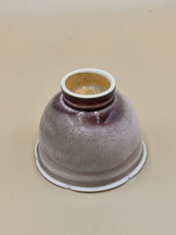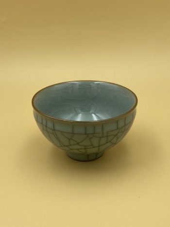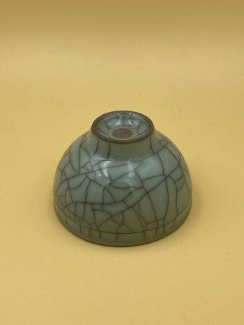Чашка со стенками средней толщины, темно-серого цвета и эффектом кракле. Рисунок из трещинок на внешней стороне закрашен черной глазурью для создания эффекта наработанности.